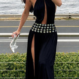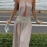 - Halter Tied Neck, Open Back, Side Slit, Maxi Length