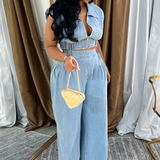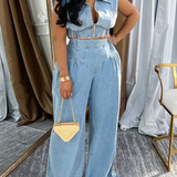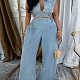 Denim Zip-Up Vest & Wide-Leg Pants Set