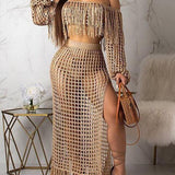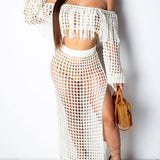 - Bateau Collar, Long Sleeves, Long Tassels, Mesh, Slit Left