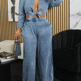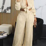 - Spread Collar, Long Sleeves, Tied Front, Wide Leg